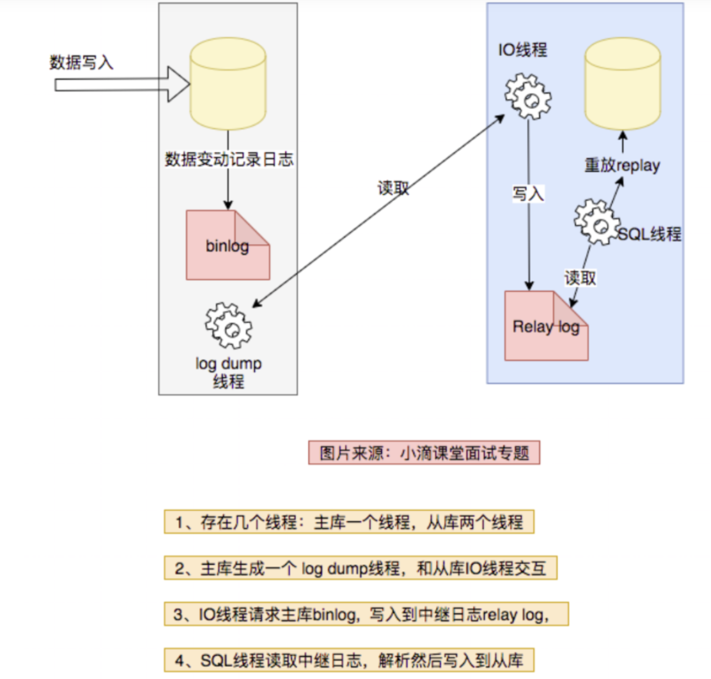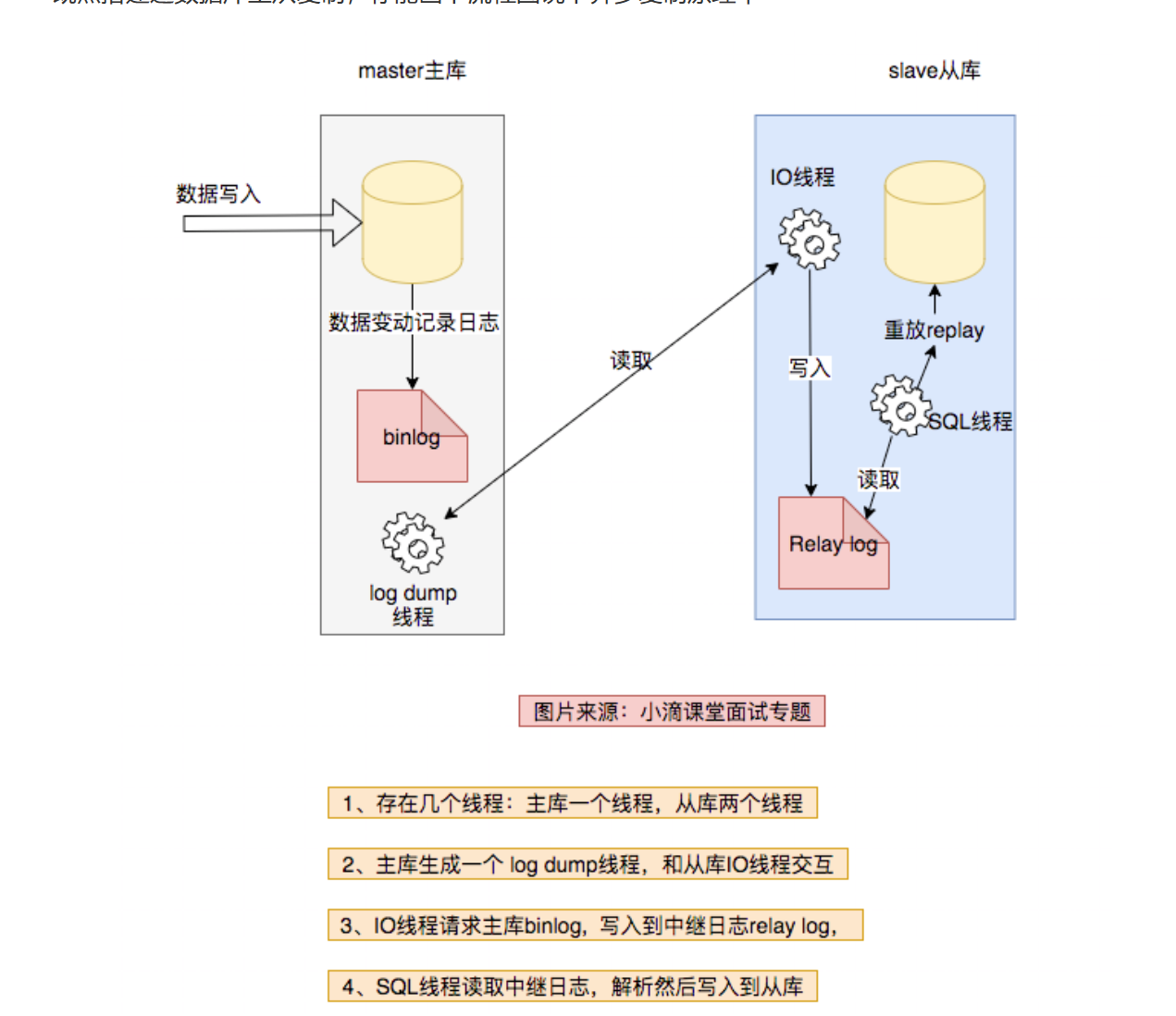 master主库有dump线程 slave从库有io线程和sql线程