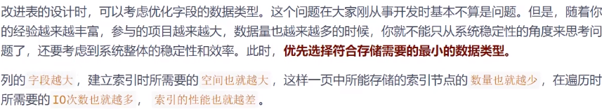 遇到整数类型的字段可以用 INT 型 。这样做的理由是,INT 型数据有足够大的取值范围,不用担心数 据超出取值范围的问题。刚开始做项目的时候,首先要保证系统的稳定性,这样设计字段类型是可以 的。但在数据量很大的时候,数据类型的定义,在很大程度上会影响到系统整体的执行效率。