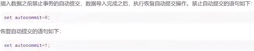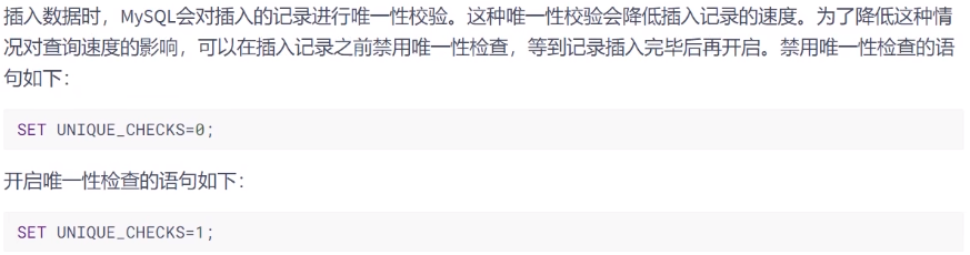 插入数据之前执行 set unique_checks=0 来禁止对唯一索引的检查,数据导入完成之后再运行 set unique_check=1 。这个和 MyISAM 引擎的使用方法一样。