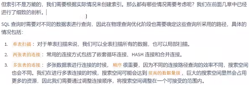 物理查询优化是在确定了逻辑查询优化之后,采用物理优化技术(比如索引等),通过计算代价模型对 各种可能的访问路径进行估算,从而找到执行方式中代价最小的作为执行计划。在这个部分中,我们需要掌握的重点是对索引的创建和使用。