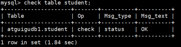 该语句对于检查的表可能会产生多行信息。最后一行有一个状态的 Msg_type 值,Msg_text 通常为 OK。 如果得到的不是 OK,通常要对其进行修复;是 OK 说明表已经是最新的了。表已经是最新的,意味着存 储引擎对这张表不必进行检查。