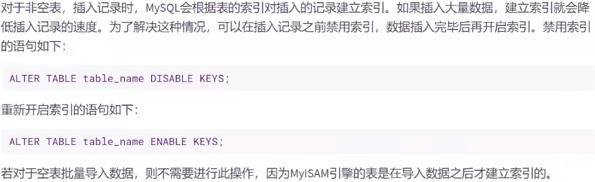 插入记录时,影响插入速度的主要是索引、唯一性校验、一次插入记录条数等。根据这些情况可以分别进行优化。这里我们分为 MyISAM 引擎和 InnoDB 引擎来讲。