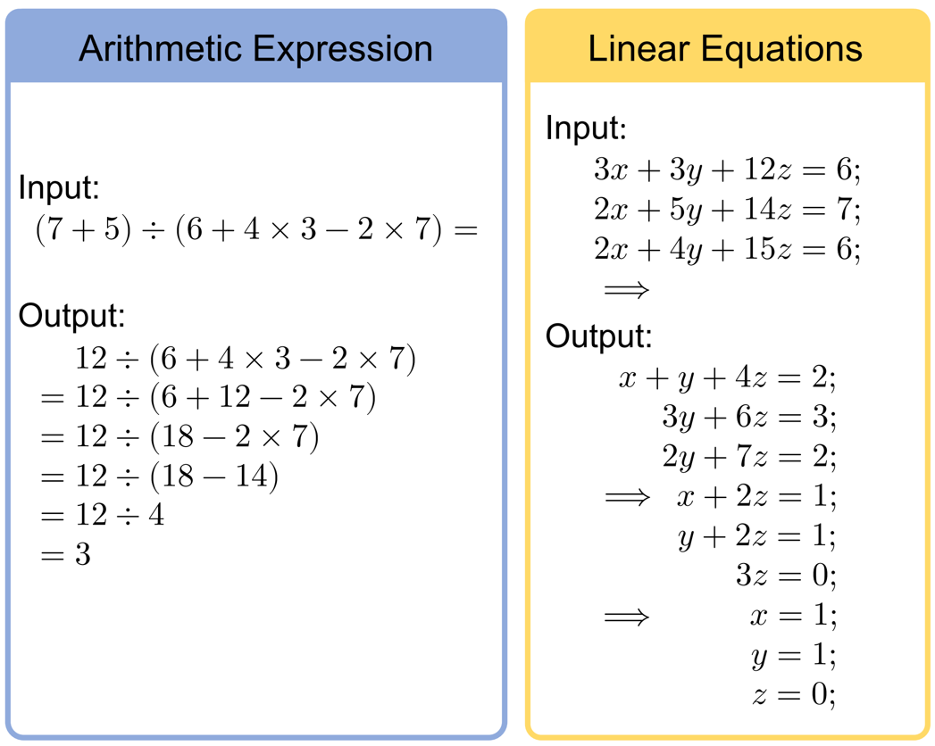 为了研究大模型在数学方面的能力,本文选取了两个非常基础但核心的数学任务:算术和方程(下图给出了这两个任务的输入输出示例)。由于它们是解决复杂数学问题的基本组件,因此通过对这两个核心数学问题的研究,我们可以对大模型在一般数学问题上的能力有一个更深刻的理解。