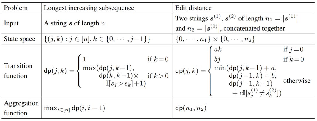 最长上升子序列(LIS)和求解编辑距离(ED)是《算法导论》一书中提出的两个著名的 DP 问题,下表列出了这两个问题的状态空间、转移函数的聚合函数。