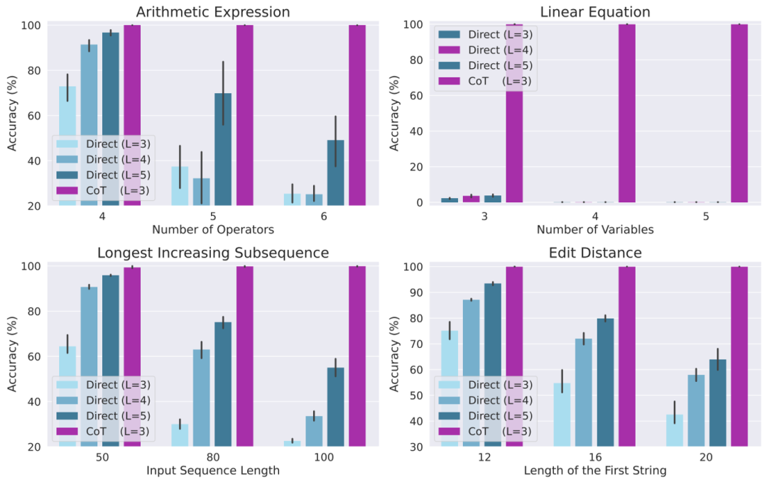 实验结果表明,当使用 CoT 数据进行训练时,一个 3 层的自回归 Transformer 模型已经能够在所有任务上均取得几乎完美的表现。然而,直接输出正确答案在所有任务上的表现都很差(即使使用更深的模型)。这一结果清楚地展示了自回归 Transformer 在解决各种复杂任务上的能力,并表明了 CoT 在解决这些任务中的重要性。