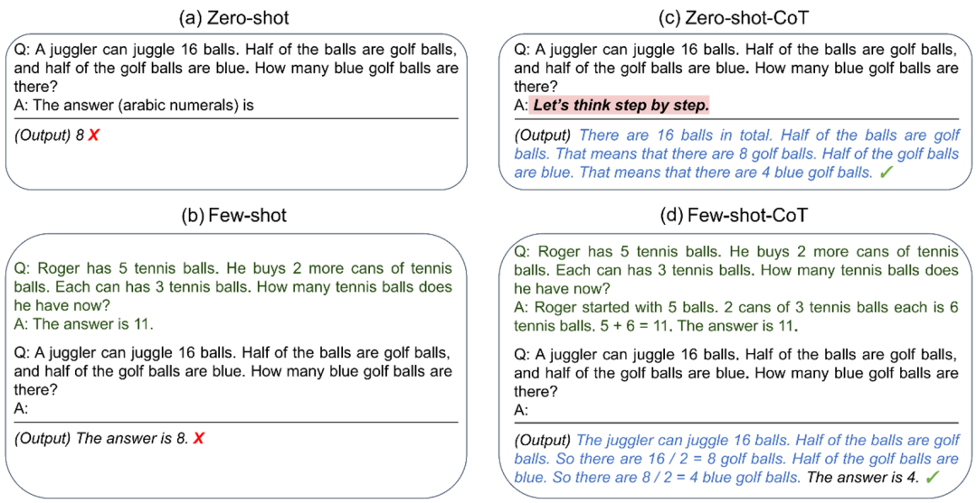 在实践中,思维链提示有两种主流的实现方式:一种是在提示中添加特定短语,如 “Let’s think step by step” 来触发(如上图 c);另一种是通过提供少量的思维链演示的例子来让大模型模拟相应的推导过程(如上图 d)。
