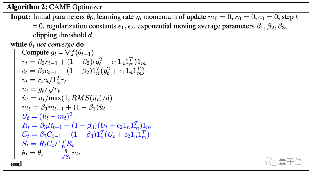 下图中的蓝色部分就是CAME相比Adafactor增加的部分。