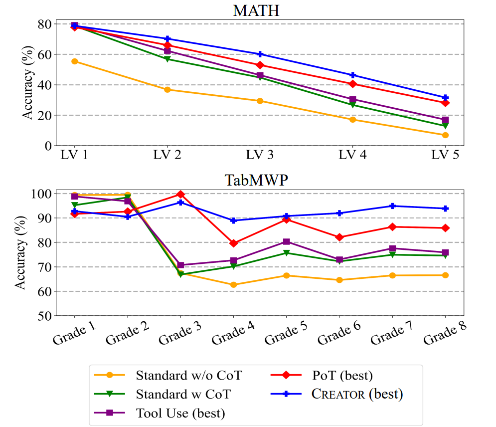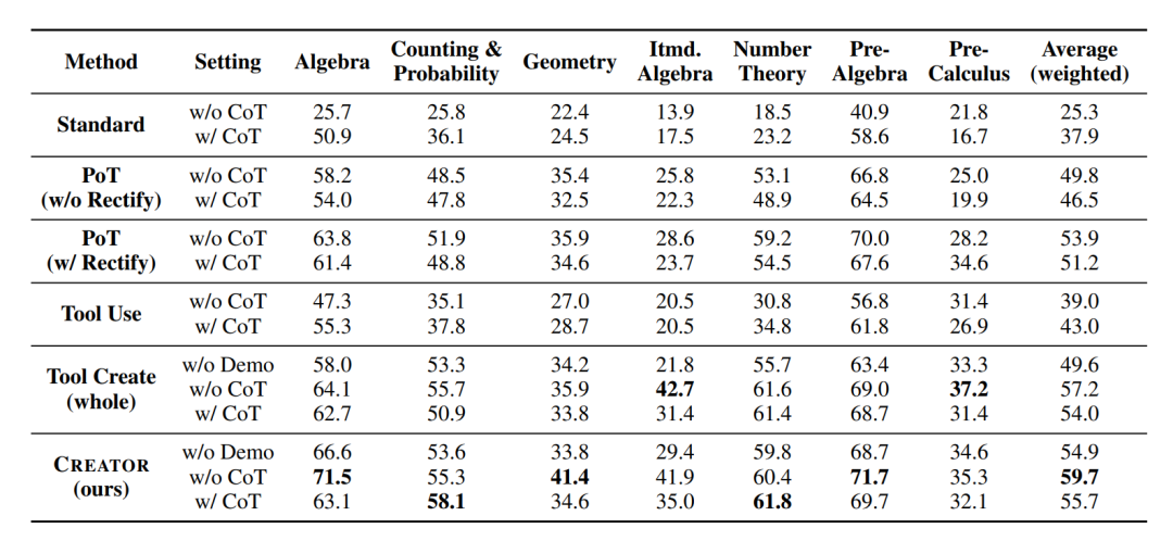 在数据集的选取上,作者选择了 MATH 以及 TabMWP 数据集作为主要验证。其中前者包含了美国数学竞赛当中的高难度数学问题,而后者将问题与丰富的数据表结合,二者都考验了模型对于多样化场景的问题推理与解决能力。除此之外,作者还额外引入了全新构建的 Creation Challenge 数据集,其中的问题都无法直接套用现有工具或者代码包解决,从而考验了模型进行工具创造的能力。