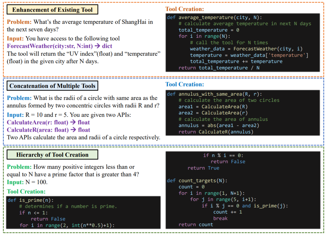 除此之外,作者还展示了大模型进行工具创造的三个维度:对已有工具进行封装以实现不同目的,将不同工具进行组合实现目标功能,以及进行层次化的工具创建。这三个维度由低到高展示了当下大模型工具创造的能力,而这些能力也帮助大模型能够更高效地适应不同场景。