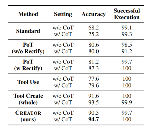 作者将 CREATOR 框架与当前的普通推理链方法(CoT),程序推理链方法(Program-of-Thought, PoT)以及没有创造的简单工具使用(Tool Use)进行了比对。同时,为了验证框架中剥离抽象推理与具象推理的有效性,作者还额外引入了整体工具创造(Tool Create - whole)作为基线,该方法将 CREATOR 框架中的创造阶段与决策阶段合二为一,不再进行推理能力上的解耦。