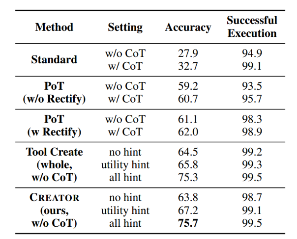 从实验结果看来,CREATOR 框架的推理结果要明显好于所有基线,尤其相对于标准的推理方法以及程序推理方法,均达到了更好的效果。同时实验也证明了对抽象与具象推理能力进行解耦也可以有效帮助模型提高准确率。在 Creation Challenge 测试集上,作者还额外验证了在有创造什么样的工具的提示(hint)的情况下,模型将会对问题有着更强的解决能力。因此,提示与思维解耦这两点也成为了工具创造中的重要影响因素。
