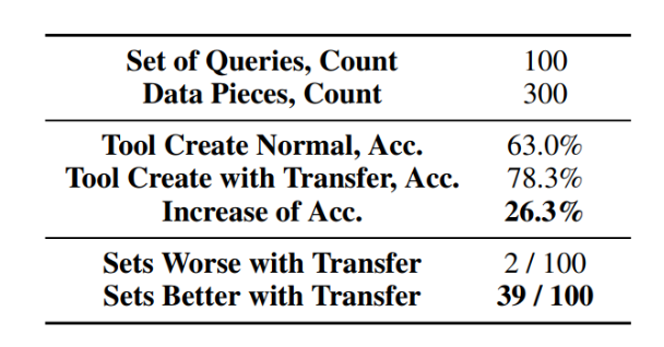 作者设计了 300 条问题并三个一组分为了 100 组。其中每一组的三个问题虽然场景不同,但都涉及相同的核心知识(Core Knowledge),即同类问题。作者验证了将对于一个问题创造的工具用于一组问题中的所有场景,是否都能够有效解决并提升准确率。