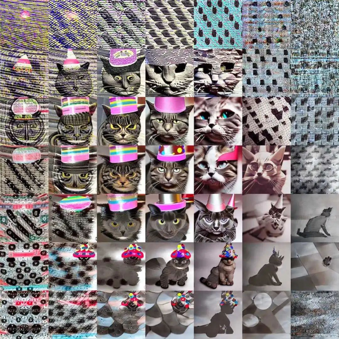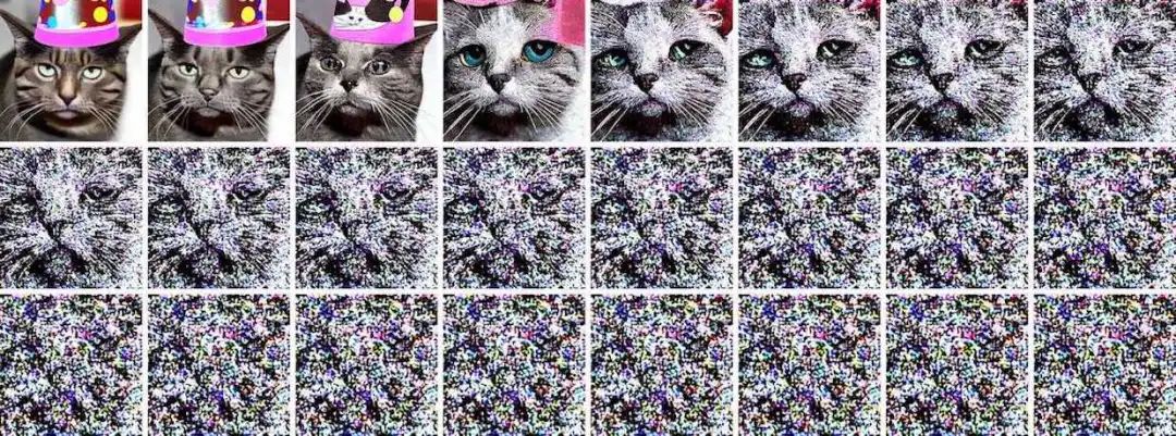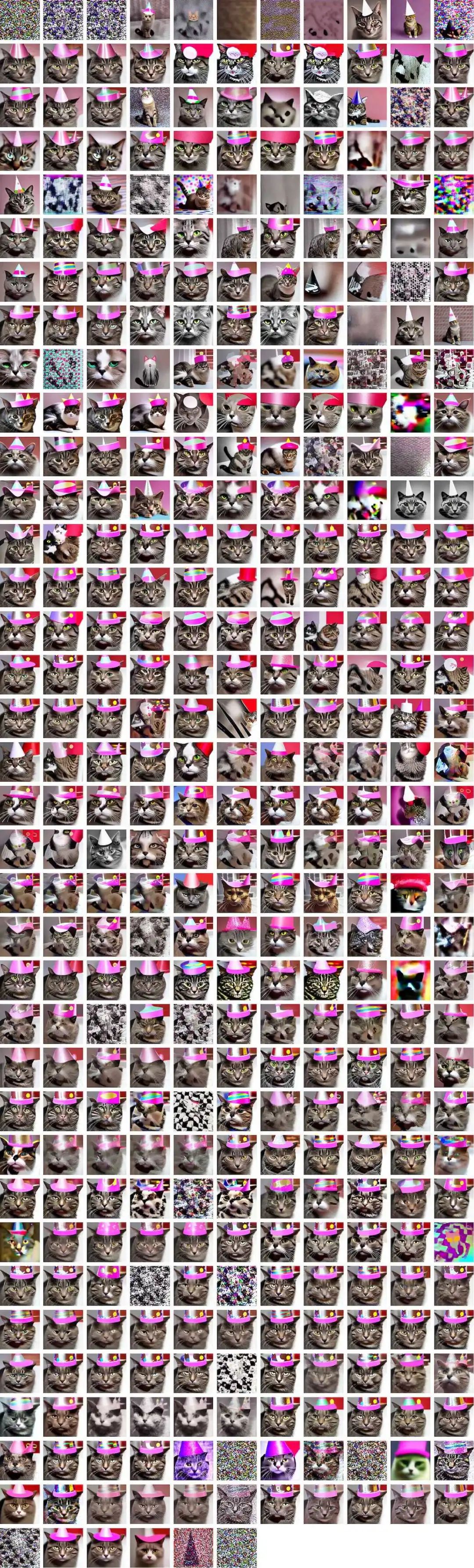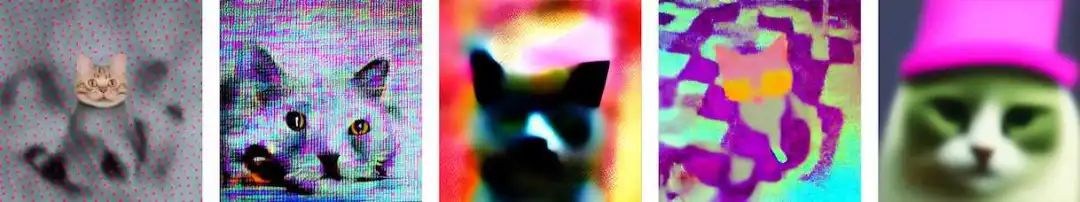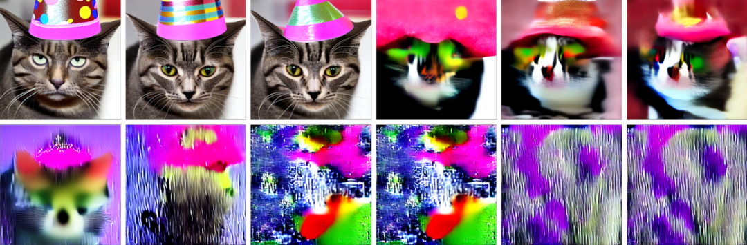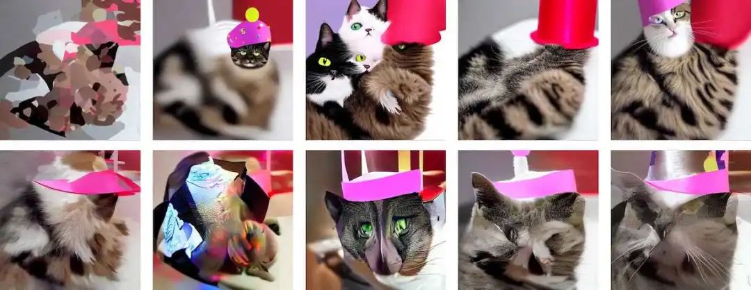 如果要求神经网络生成一张「戴着派对帽的猫」的图片,得到如下图片: