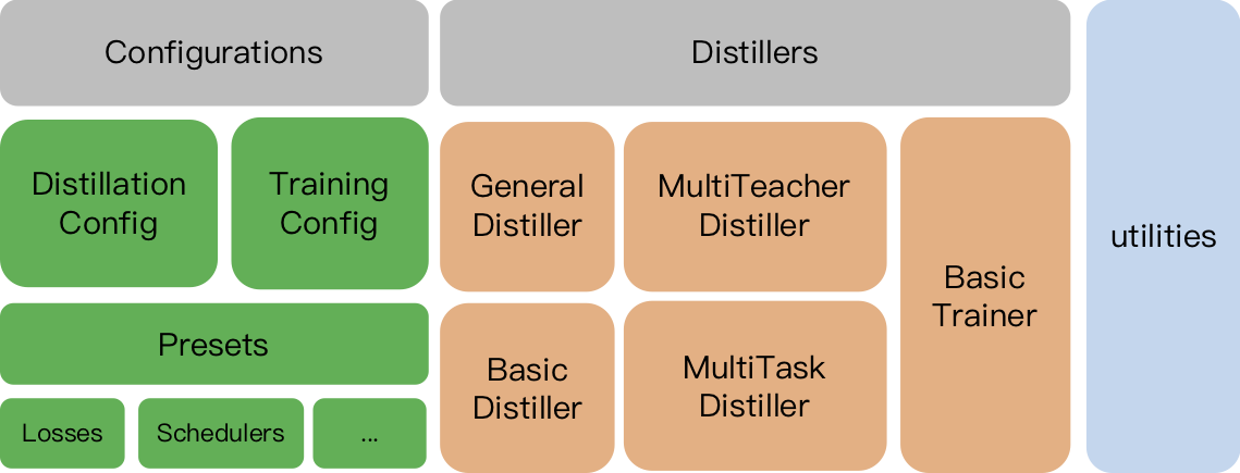 TrainingConfig 和 DistillationConfig:训练和蒸馏相关的配置。Distiller负责执行实际的蒸馏过程。目前实现了以下的distillers: