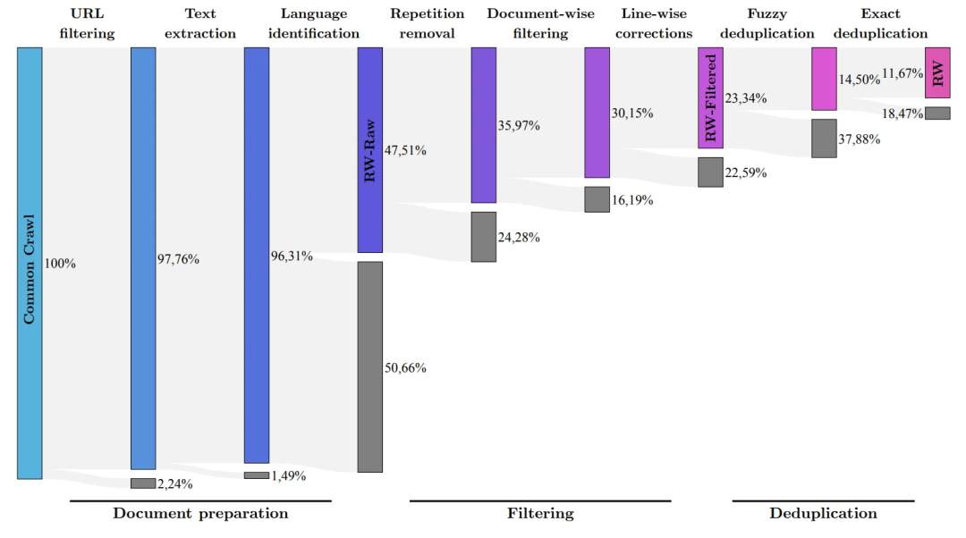 在彻底清理多余重复内容后,保留了 5 万亿的token——足以训练强大的语言模型。