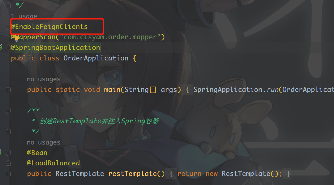 </dependency>在 order-service 的启动类添加注解开启 Feign 的功能: