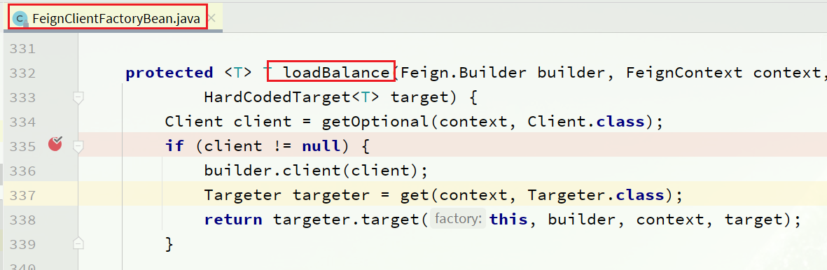 max-connections-per-route: 50 # 每个路径的最大连接数接下来,在 FeignClientFactoryBean 中的 loadBalance 方法中打断点: