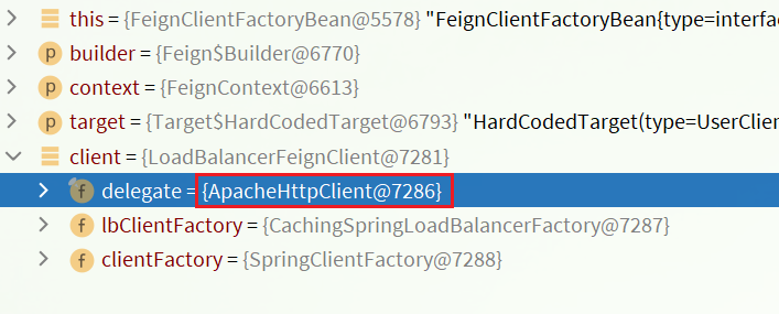 Debug 方式启动 order-service 服务,可以看到这里的 client,底层就是 Apache HttpClient :