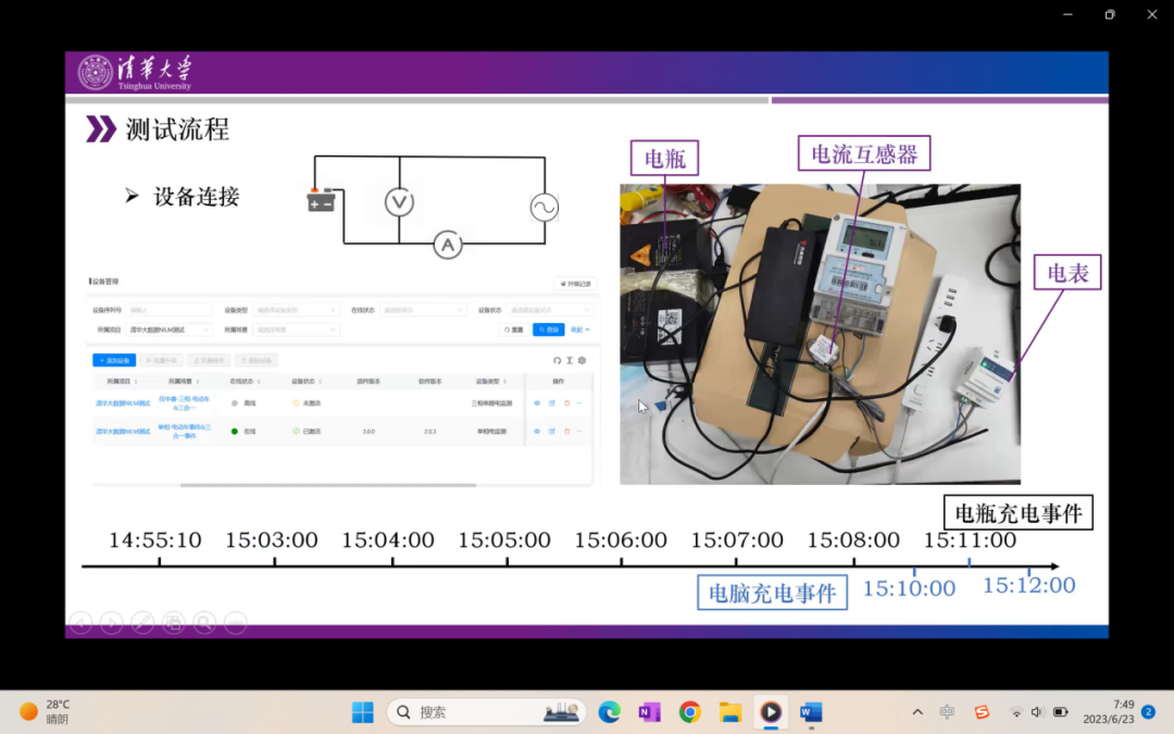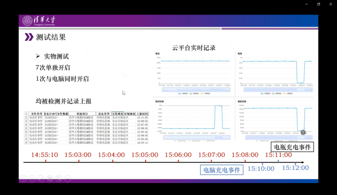 通过设备的实地连接打通以上步骤,此处是将电表通上电,然后进入云端。使用电动车的电池电瓶进行测试,示意图是上图。将电动车电池接入220伏的电压电表,单独对电池电压和电流进行记录,同时在云平台里新建负荷辨识的测试项目。平台测试显示与边缘侧设备进行了连接和激活,测试方式主要是通过反复的插拔电动车充电插头,同时穿插一些其他设备的充电去检测是否能成功识别电瓶的充电事件。