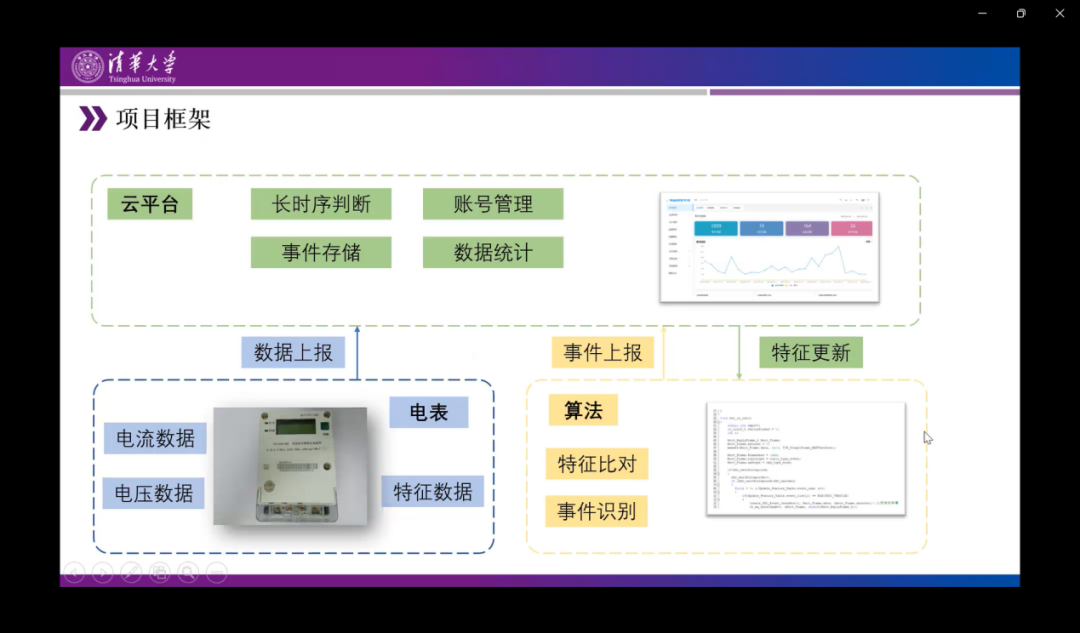 接下来是技术路线。首先,项目框架分为边缘测电表、算法和云平台三部分,电表对用户的电流电压数据进行记录,并提取特征数据在边缘侧实现特征比对和事件的识别。同时通过电表上报数据和检测的时间情况。云平台对数据进行长时序存储、事件存储进行判断,还有对账号项目进行管理。云平台也会双向对检测的特征进行更新。
