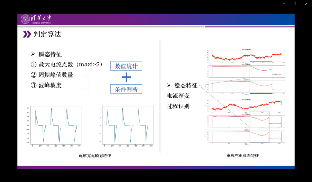 同样是以此时的特征为例,别的判断算法主要是通过瞬态的特征判断,这里是根据最大电流量、单周期的电流大峰次数、波动幅度还有控制时间等数值统计和条件判断来比对当前的电流特征是否与充电特征相匹配。稳态特征主要是根据电流的渐变过程识别,这是通过云平台存储的长时序数据去识别电瓶充电的电流变化特征,进行二次的事件判断和核实。