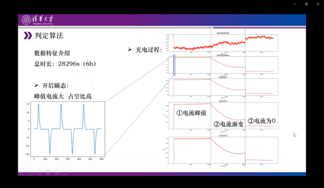 针对电动车充电事件可以分为瞬态特征与稳态特征。左下图是电流的瞬态特征,其中的尖峰大,占空比高,右侧列出了一次记录的典型数据,总时长接近六个小时,那么右图从上到下是电压数据、电流数据还有各类的功率数据,那么其中电动车电池开始充电时,电压是有一处突变,同时电流和功率有明显的图层变化,此时是充电开始。再往后出现充电过程分为电流峰值、电流渐变还有最后电流为0三个过程,到第三过程的时候电磁电量已经充满。