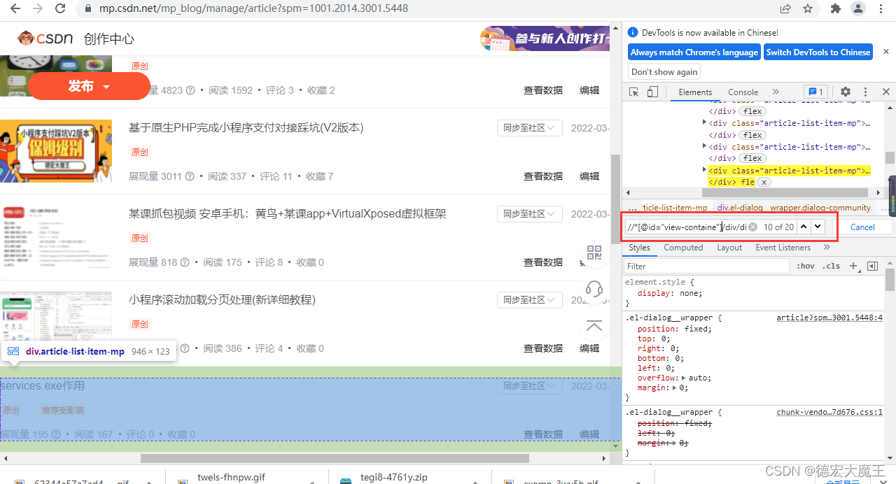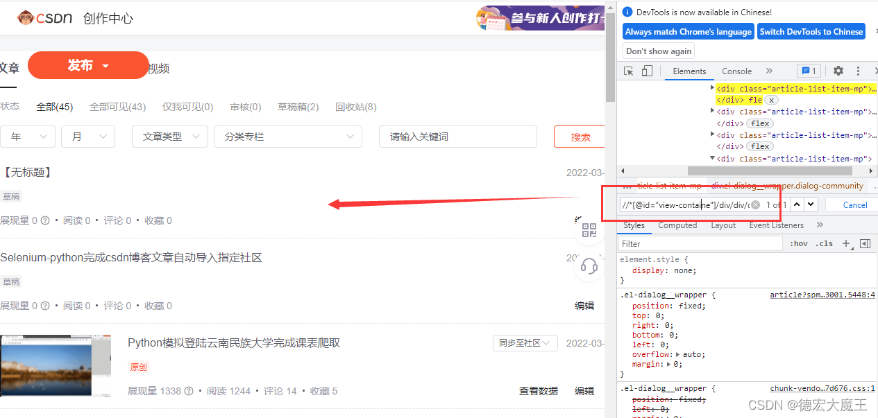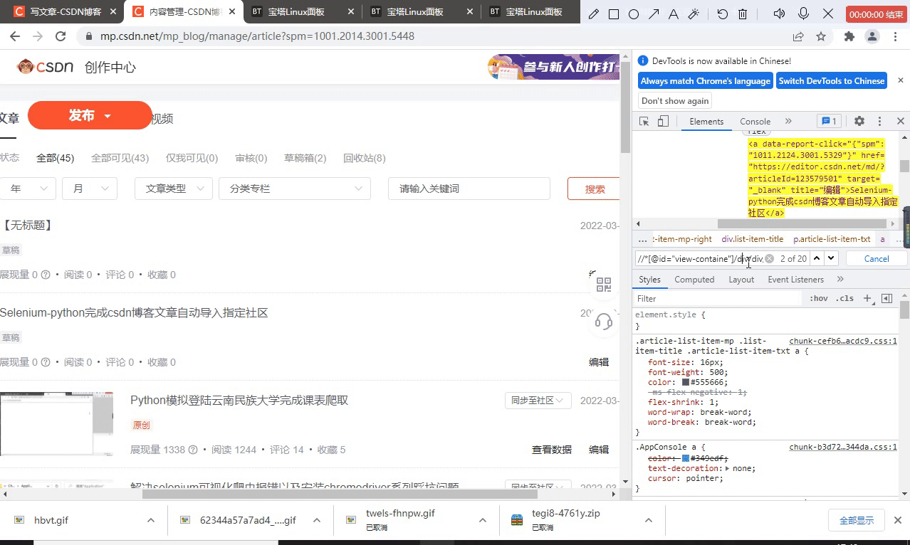 通过遍历获得每个文章的名称的代码为(我已经验证过是可以的,但是并没有截图记录,完整代码用的是find_element_by_css_selector效果其实一样的,也可以用这样的方法进行处理):