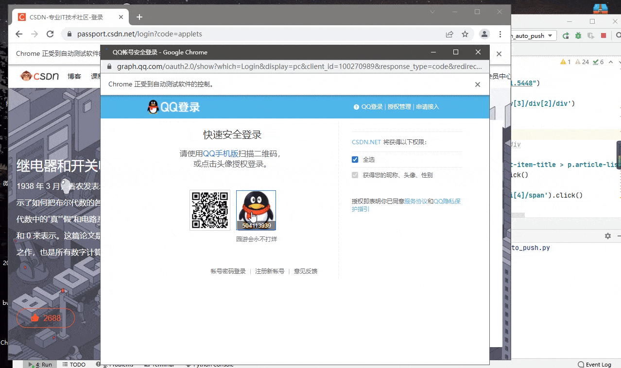 由于打开的是谷歌浏览器驱动,所以一些网站会被限制访问登录,解决办法C站很多,对于C站来说,用账户密码登录,过了验证码也没办法登录,但是可以用QQ登录,经过一下午的测试,测试中由于打开过多,导致C站限制了ip,最简单办法连接热点就过了