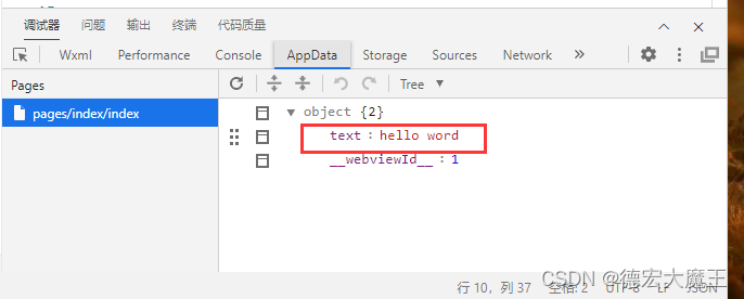 那这些方法怎么用呢? 举个例子:如果我将index.js中的data方法里面加入数据 text: “hello word” 修改后,如图所示