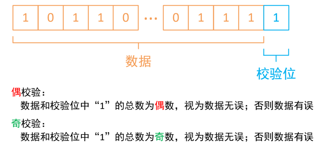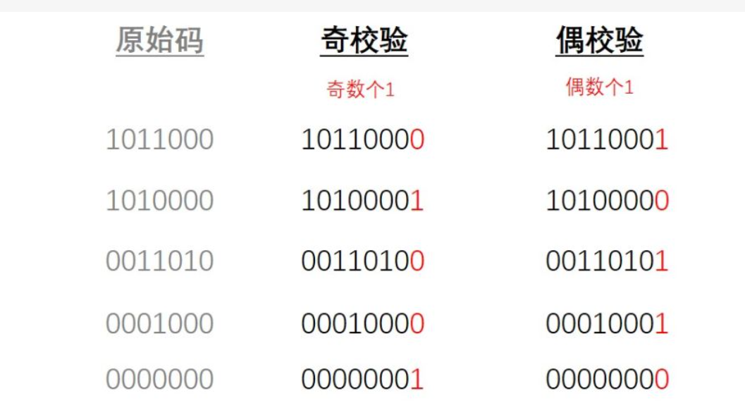 (1)发送端:在发送数据字节之前,统计数据字节中1的个数,根据个数设置奇偶校验位的值,并将数据字节和奇偶校验位一起发送。