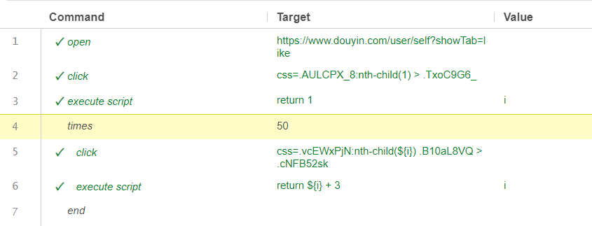 self.vars["i"] = self.driver.execute_script("return arguments[0] + 3", self.vars["i"])在实际场景中,要清空抖音关注列表,需要用户自己手动一个一个取关,这样子又累又低效,而去刷 API 接口又不太友善且会被封号,因此使用 Selenium IDE 来模仿人的操作,以相近的频率来实现自动取关。