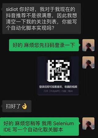 这个自动化脚本的背景大概就是,有一位粉丝对于抖音现在推荐给他的视频不太满意,因此他想清空一下关注列表,以此来重塑一下他抖音的个性化推荐算法,因此,用了 Selenium IDE 完成了这次的需求。