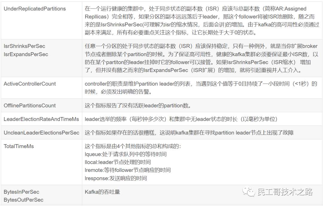通过官方网站的说明(http://kafka.apache.org/documentation/#monitoring),可以查看Kafka提供的所有的监控指标参数。在这里只是列出了部分主要的参数指标。