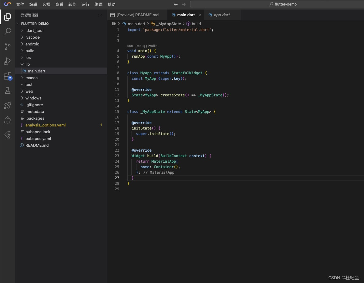 此处我们可以看到,此时的目录文件只剩下main.dart文件,并且 main.dart文件中代码也进行了简化,代码如下: