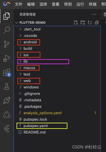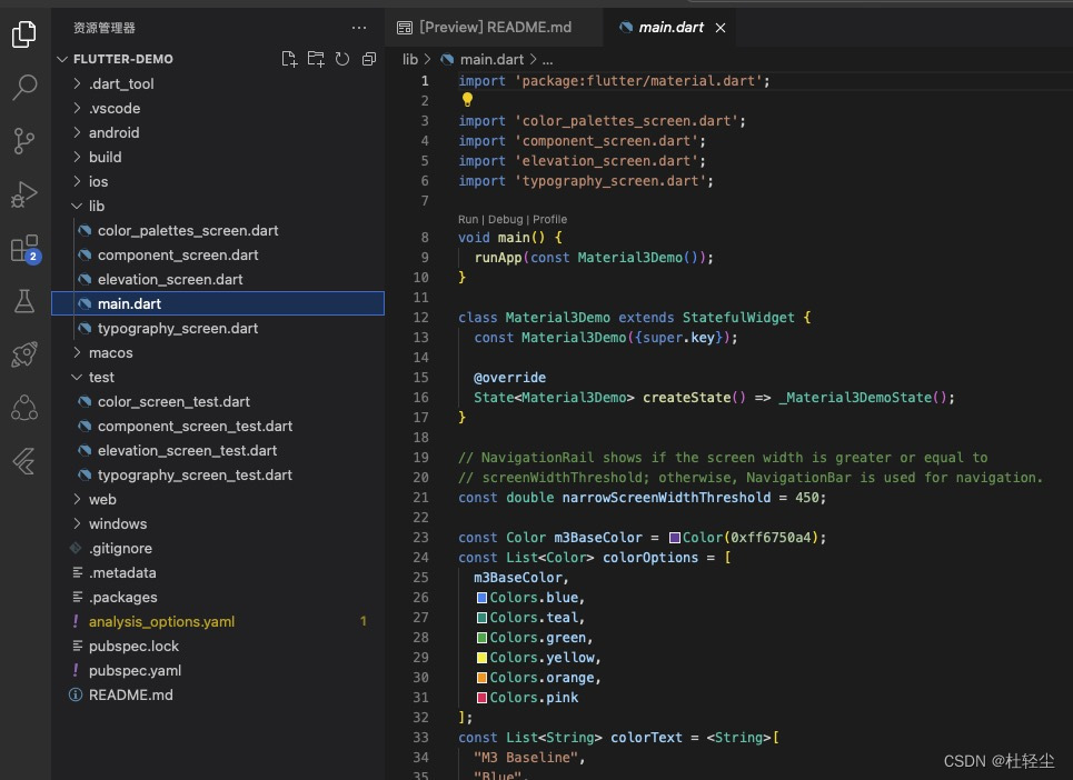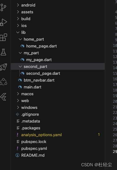 我们可以看到图中有大量的 .dart 文件,这是系统给我们预设的一些颜色、字体、等等配置文件,此时我们不需要这些文件的存在,下面简化一下这个文件目录页面。