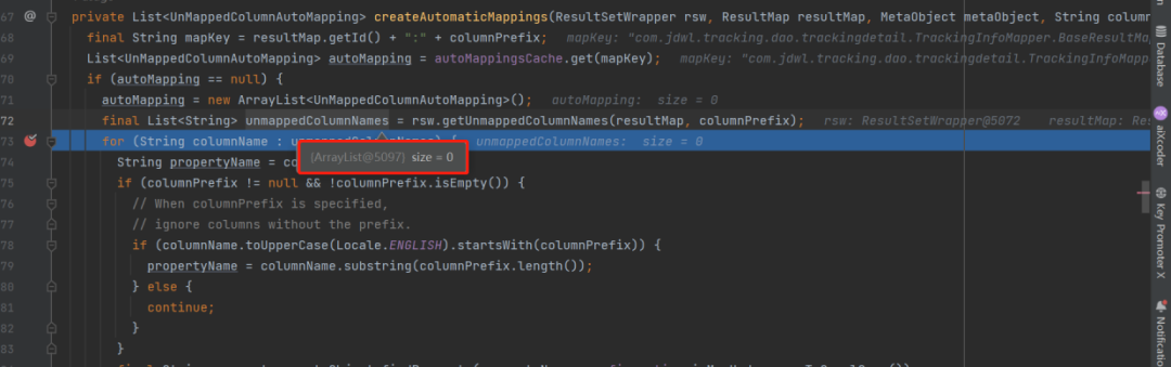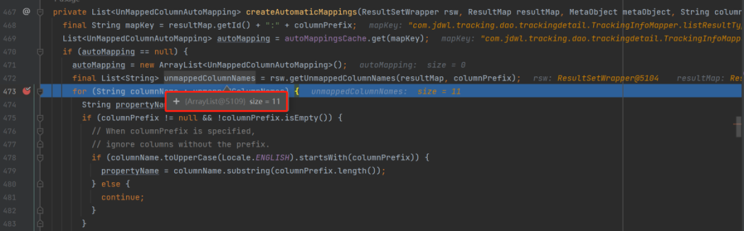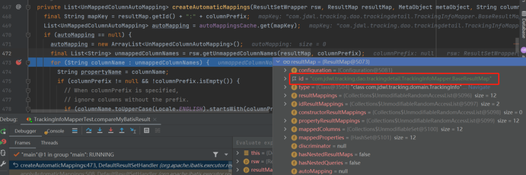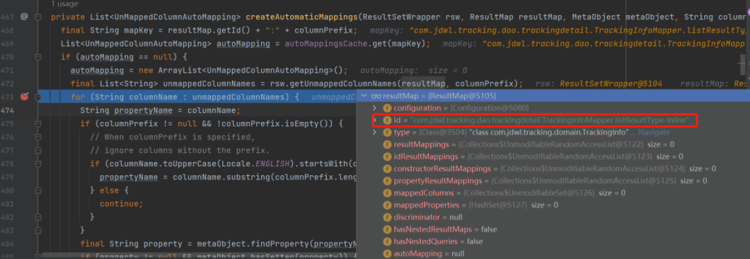 List<TrackingInfo> result2 = trackingInfoMapper.listResultType(record);再对返回结果 Handler 处理类 org.apache.ibatis.executor.resultset.DefaultResultSetHandler#createAutomaticMappings() 进行 debug 分析。