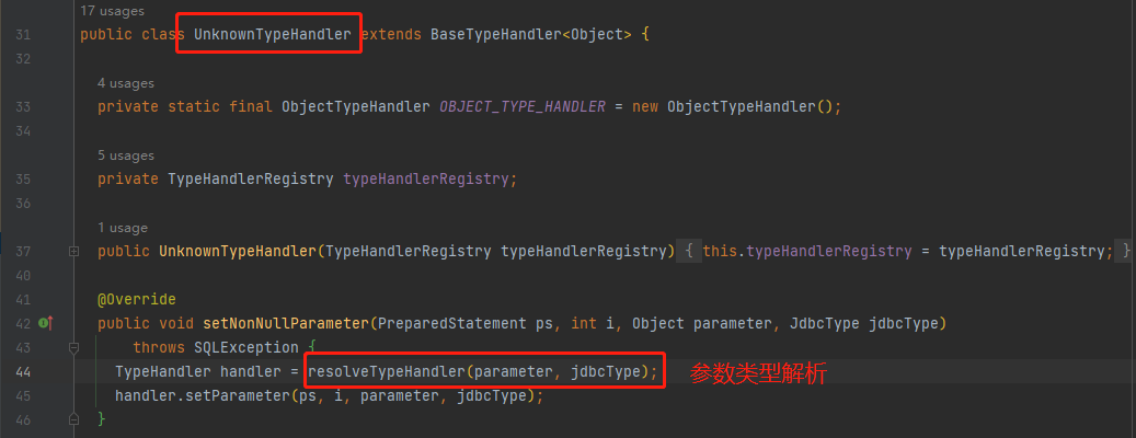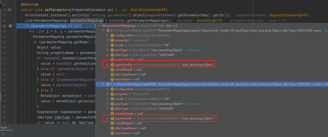 两个参数的解析都是 UnknownTypeHandler(红框中灰色的字),而在 UnknownTypeHandler 中会再次调用 resolveTypeHandler() 方法,对参数进行类型的二次解析。可以理解为 Map 里的属性不是固定类型,只能在执行 SQL 时候再解析一次。