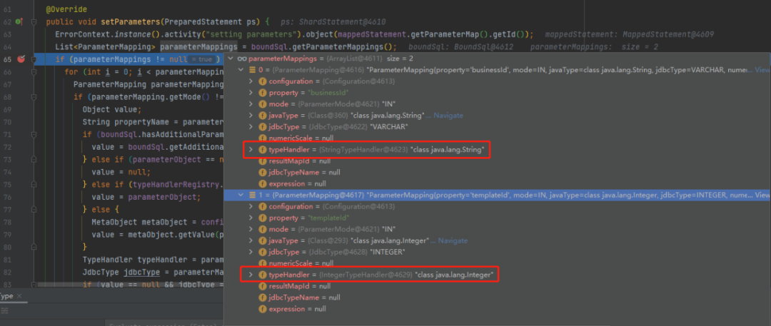 两个参数的解析类型分别为 StringTypeHandler(红框中灰色的字)与 IntegerTypeHandler(红框中灰色的字),已经是 Mybatis 提供的 TypeHandler,并没有再进行类型的二次解析。说明 JavaBean 中的 businessId、templateId 字段已经在启动时候被预解析了。