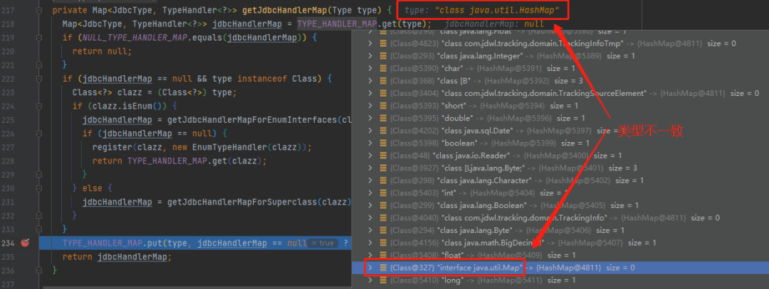 从 debug 信息中可以看出,TypeHandler 缓存中存在的是 interface java.util.Map,而 SQL 执行时传入的是 class java.util.HashMap,导致并没有命中缓存。那修改下 xml 文件为 parameterType="java.util.HashMap" 是不是就解决了?