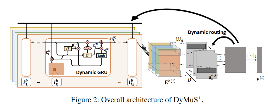 基于以上挑战,本文提出了动态多行为序列建模的新方法,即轻量版的DyMuS和改进版的DyMuS+。其中,DyMuS首先利用门循环单元(GRU)对每个行为序列进行独立编码,然后使用动态路由将编码的序列根据序列之间的相关性结合起来,从众多候选者中动态地整合最终结果所需的信息。