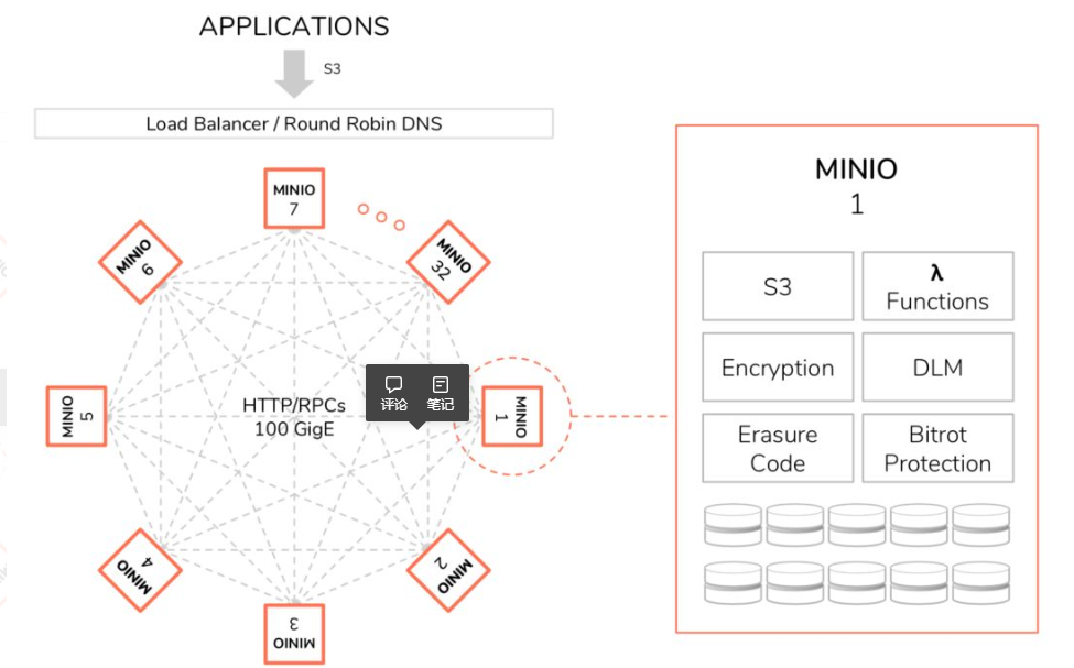 它是一个基于Apache License v2.0开源协议的高性能的 分布式 对象存储服务器, 也是使用Go语言开发, 整个系统都运行在操作系统的用户态空间。客户端与存储服务器之间采用http/https通信协议。专为大规模数据基础架构而设计,它 兼容亚马逊S3云存储服务接口 , 非常适合于存储大容量非结构化的数据 ,例如图片、视频、日志文件、备份数据和容器/虚拟机镜像等,而一个对象文件可以是任意大小,从小到kb级别到最大5T不等,使用 纠删码(erasure code) 和 校验(checksum) 技术来保护数据免受硬件故障, 即便您丢失一半数量(N/2)的硬盘,您仍然可以恢复数据。