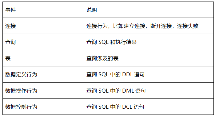 AntDB-M的审计功能中的事件(events),是指数据库内部的操作行为,包括:连接、查询、表、数据定义行为、数据操作行为、数据控制行为,这些操作都支持记录到审计日志中,也可以通过配置项audit_logging_events配置部分要关注的事件。