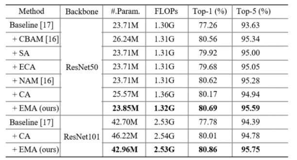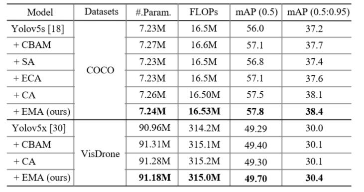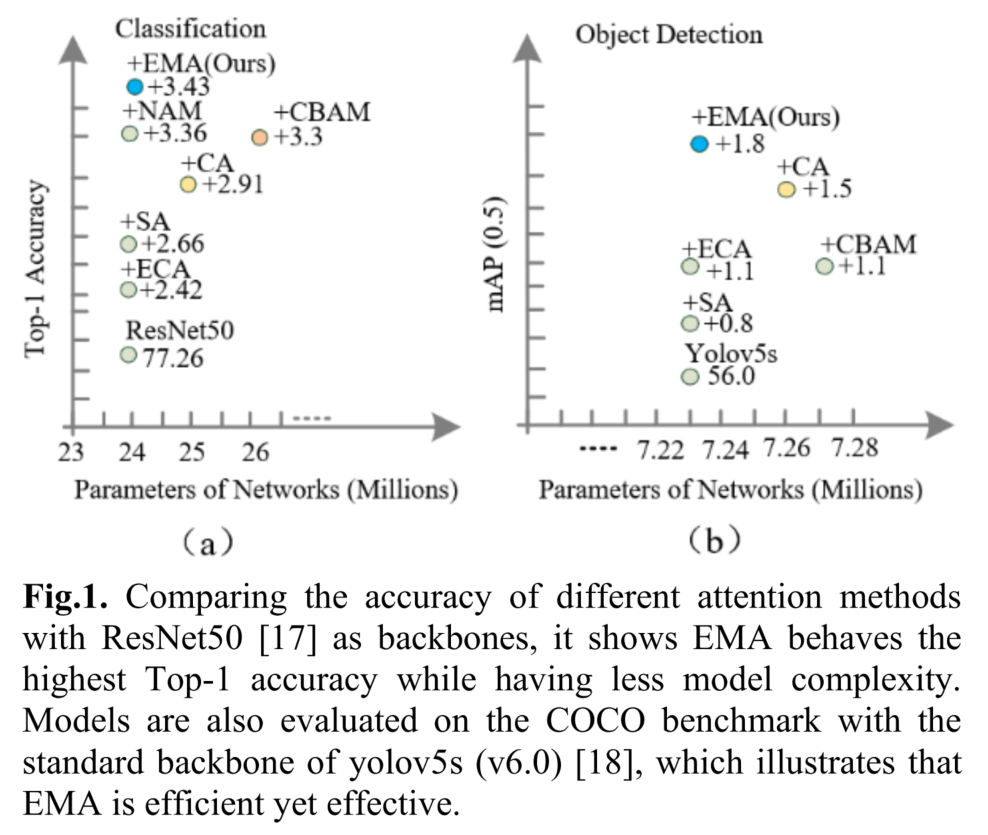 为了证明提出的EMA的通用性,第4节介绍了详细的实验,包括CIFAR-100、ImageNet-1k、COCO和VisDrone2019基准的结果。连同图像分类和目标检测任务的实验结果如图1所示。