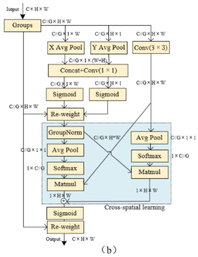 分支中的两个平行路线之间实现不同的跨通道交互特征,通过简单的乘法将每组内的两个通道注意力图聚合在一起。