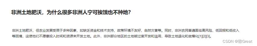 5. 农业技术落后:在非洲的一些地区,传统的农用机械设备已经过时且难以维修维护,这限制了农田的产量和质量。(4)模型解码超参数对生成性能有影响 下面是两组解码参数,配置2相比配置1可以使模型生成更加多样灵活,随机性更强,生成文本偏长