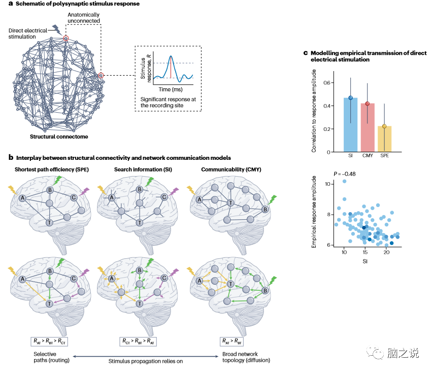 图4 网络传播模型的可解释性洞察:一个脑刺激案例研究。a,通过局灶直接电刺激传递的脉冲在远端解剖上不相连的部位引起皮质-皮质诱发反应。b,网络通信测量根据白质连接的不同特征量化通过连接体的信号。比较刺激诱发反应(R)强度的差异有多大,可以用不同的测量方法来解释,这可以让我们深入了解神经通讯动力学。从节点A, B和C到目标节点T的最短路径长度(左)完全基于它们之间最直接路径的连接。根据最短路径模型,A、C波段的刺激应引起R>R>Rcr的反应。搜索信息(中心)与沿着最短路径从源节点到目标节点的无偏随机行走的概率有关,该值由组成路径的节点的局部连通性决定。因此,搜索信息不仅对网络的最短路径结构敏感,而且对局部拓扑特征敏感。在大脑刺激的背景下,搜索信息可以被解释为刺激点和靶点之间刺激分散的倾向。尽管A、B、C到T的最短路径长度相同,但搜索信息预测R>Rer>RAr。可通信性(右)考虑了通过所有网络行走的广播。它对节点可以通过多个备选路由进行通信的程度进行索引,其中短路径比长路径贡献更多。在这里,尽管A和B到T的最短路径长度相同,但可通信性预测R>R,因为A到T的短路径数量更多。c,直接电刺激后网络通信测量与经验观察到的响应幅度之间的相关性。诱发反应是侵入性地从解剖上不相连的部位之间的颅内脑电图记录推断的。与最短路径效率相比,搜索信息和沟通能力解释了刺激传播的更多差异,从而深入了解了白质连接的哪些特征决定了人类大脑中的多突触沟通。