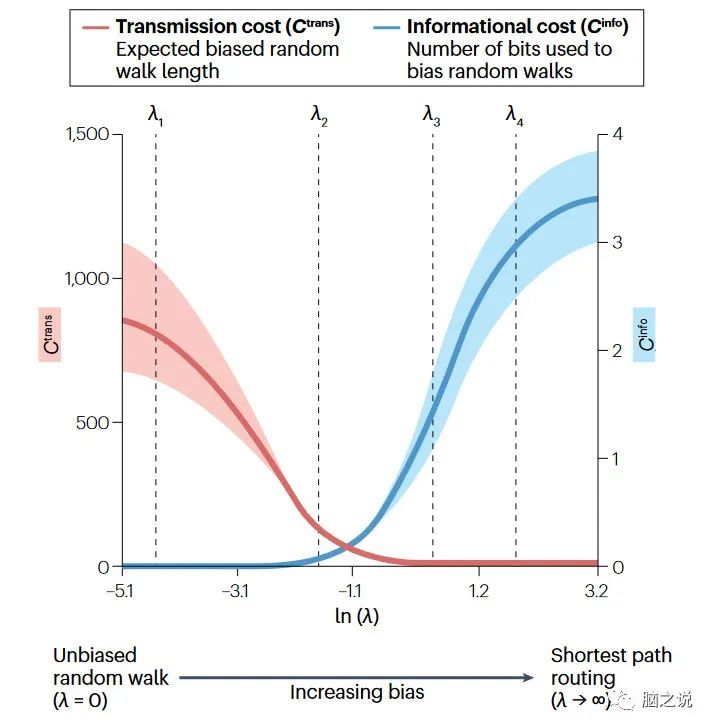 Box 3 参数度量: 探索通信成本的权衡。激活时间是线性阈值模型的主要通信度量。它量化了向网络传递扰动后两个节点激活之间的延迟。与阈值模型的可调参数相结合,这种简单的方法可以用来模拟复杂的扩散动力学,并且在神经级联的计算和经验研究中都有应用。有偏差的随机漫步产生了一个连续的通信策略频谱,可以对延迟和信息成本之间的权衡进行定量分析。凭直觉。经验连接组分析表明,增加λ(节点可获得的全局信息量)导致平均信息成本单调增加,节点对之间的平均传输延迟减少62(见图)。然而,重要的是,这两种成本的变化率并不相同,a值的范围很窄,可以实现低的信息成本和延迟成本。这表明连接体拓扑结构可能被组织成这样,即引入微妙的偏差因素可能会在通信效率方面获得不成比例的巨大收益。提出了两种网络通信方法来研究最短路径集成的特性。最短路径长度是一种结合了信号效率和信息成本概念的混合度量。k边不相交路径量化了一个集合中不与任何其他路径共享连接的路径的数量。它是对网络要素故障(如灰质区域退化)时通信恢复能力的一种衡量。