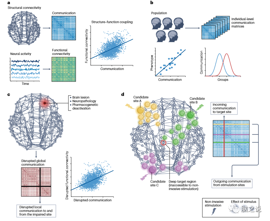 图3通信矩阵的当前和新兴应用。网络通信模型和度量用于计算通信矩阵,通信矩阵将结构连通性网络转换为神经元素对之间信号的定量估计(图1b)。a,功能连接矩阵在时间序列中捕获成对的神经活动关联。大量研究表明,通信矩阵可以解释功能连接的多个方面。在这个方向上的大多数工作都考虑了静息状态功能MRI的数据,但最近的研究正在将这些努力扩展到神经活动的电生理记录。b,学科水平的通信矩阵可用于研究神经信号如何与认知、行为和临床变量相。在全脑水平上,对通信矩阵的所有条目进行平均,可以提供连接组通信的单值总结,这可以与感兴趣的表型相关。也许更有趣的是,通信矩阵的子集可用于测试关于特定区域或系统的假设,例如,同调区域之间或感兴趣的功能系统内的通信。c,通信矩阵可以量化由于局部损伤,病理或故障导致的区域间信号的全局中断。结构损伤可以在动物模型中使用控制操作进行研究,并通过从连接中删除节点和连接在计算机上进行模拟。在人类中,沟通措施已被用于模拟多发性硬化症(1%)、中和创伤性脑损伤患者的真实协调中断。d,局灶性脑刺激的非局部效应可以从通信矩阵中推断出来。通信矩阵的行(列)量化了传出(传入)区域通信。第i行模型刺激从区域i到网络其余部分的传输。相反,第j列量化了从所有区域到区域j的传输。在受试者特定的连接组上计算,这些测量可以帮助完善临床脑刺激的个性化方案,并通过非侵入性技术(如经颅磁刺激)为间接调节深部结构的刺激点的选择提供信息。