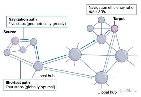 Box1 路由措施:对通信效率进行基准测试。最短路径长度量化了两个节点之间移动的最小可能代价或延迟(见图)。它可以根据步骤数或沿着路径的连接长度的总和来定义。值得注意的是,这种度量通常被简单地称为“路径长度”,因为通常假设神经通信沿着最短路径进行。网络的特征路径长度是小世界架构的基石之一,它被定义为其所有节点对的平均最短路径长度。另一种方法是根据效率来量化沟通。最短路径效率定义为沿最短路径的连接长度的倒数之和,网络的整体效率由其所有节点对的平均最短路径效率给出。对于任何网络,最短路径路由都提供了通信效率的上限。因此,最短路径度量通常用作评估其他模型的相对效率的基准。可导航性是一个广义术语,指的是作为网络通信模型的导航性能。成功率是衡量可通航性的最基本指标,定义为通过导航可以成功到达的节点对的比例。在成功路由的情况下,导航路径长度和导航效率的定义类似于其最短路径对应项——也就是说,根据包含导航路径的连接的长度来定义。同时,失败导航具有无限路径长度的特点。导航可以通过效率比作为最短路径路由的基准,效率比计算为最短路径长度与导航路径长度之比。路由倾向于遵循“细粒度、粗粒度、细粒度”的传播模式。最初,通信发生在源节点附近。一旦到达一个局部高度节点,远程连接就可以用很少的步骤遍历大距离。最后,一旦到达目标节点附近,就发出返回最终目的地的信号。在最短路径和导航路径中都可以观察到这种模式(见图),它共同依赖于高集群(支持对本地连接的细粒度探索)和互连集线器的核心(允许长距离快速通信)。