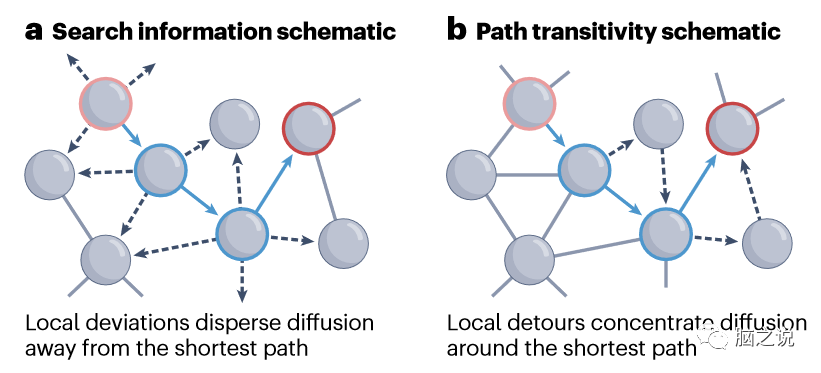 Box 2 扩散测量: 连接如何自发地形成传播。许多扩散度量描述了随机行走和最短路径之间的关系,捕获了网络拓扑自发地沿着有效路径引导随机行走的程度。搜索信息量化了使随机漫步沿着两个节点之间的最短路径展开所需的努力(以信息位为单位)。这个度量与网络中有效路径的可达性有关。本地连接(见图a部分;黑色虚线箭头)有助于偏离最短路径(蓝色箭头),有助于获得更高的搜索信息。同样,路径传递性被定义为沿最短路径的局部弯路的密度。局部绕行是一系列短暂偏离最短路径的连接,但在下游节点又反馈到最短路径(见图b部分;黑色虚线箭头),从而有助于沿有效路线集中扩散流。“资源效率”定义为在给定概率下,至少有一个信号沿着最短路径在源和目标区域之间传播所需的随机行走次数。这种独特的测量方法旨在量化路由和扩散之间的成本效率权衡,假设随机漫步的低效率可以通过增加信号副本的数量来改善。通过投入更多的资源(信号副本),随机漫步模型可以在保持低信息成本的同时实现低延迟。显然,这种效率的提高是以更高的代谢需求为代价的。可通信性提出信号在所有网络行走中同时广播,因此实现了资源效率度量的最极端场景。可沟通性的独特之处在于,它既是一种沟通模式,也是一种衡量标准,因为它将特定的广播概念与特定的公式相结合,以量化其属性。具体来说,高(低)可通信性表明两个节点之间存在许多(很少)有效的行走,这种特性可以解释为通信弹性和并行信号的总体容量。可沟通性是网络神经科学中一个流行的测量方法,是最常用的替代最短路径测量的方法之一。